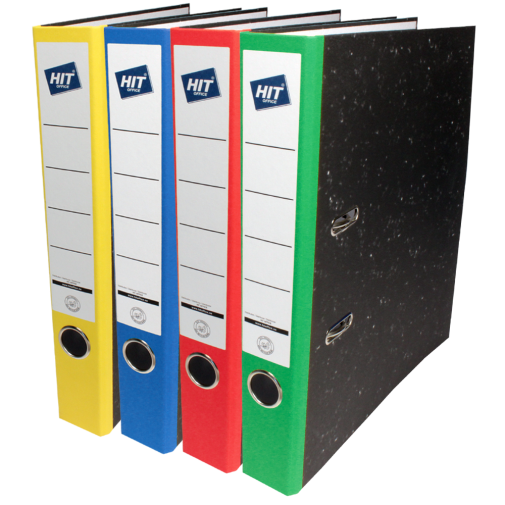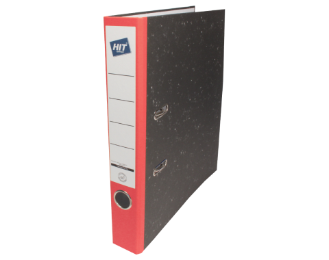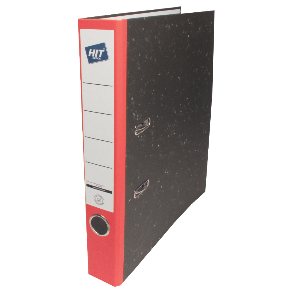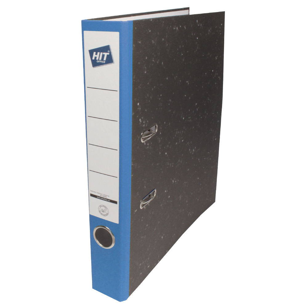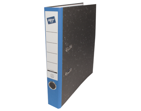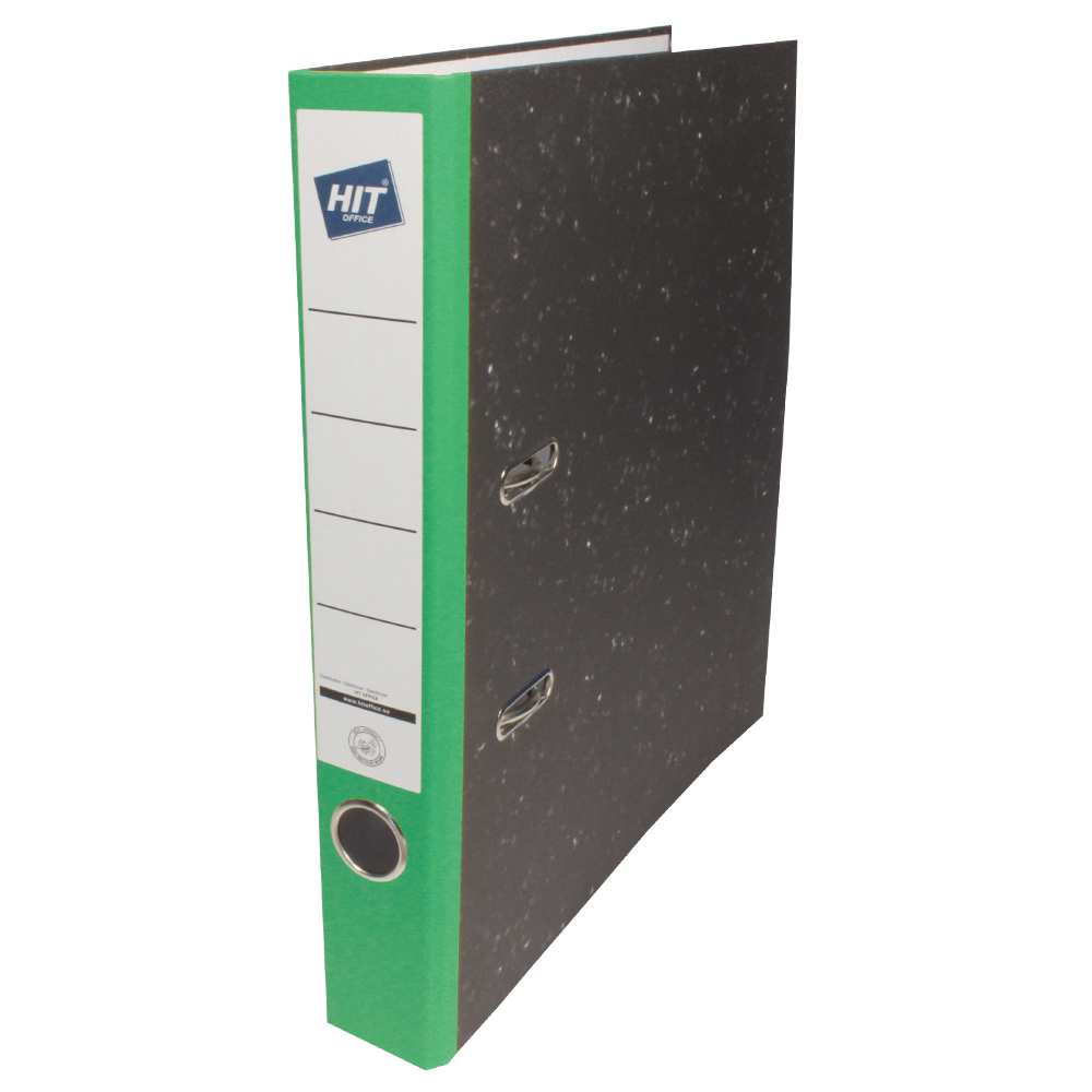 Ordner mit 5cm Rückenbreite, Hebelmechanik, Schlitzen,Griffloch, ohne metal Kantenschutz, Aussenbezug schwarzes Mramor mit farbigem Rücken, aufgeklebtes Rückenschild.