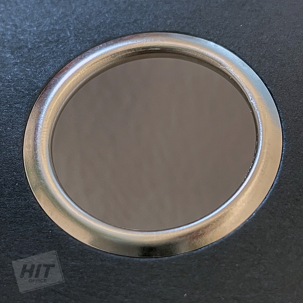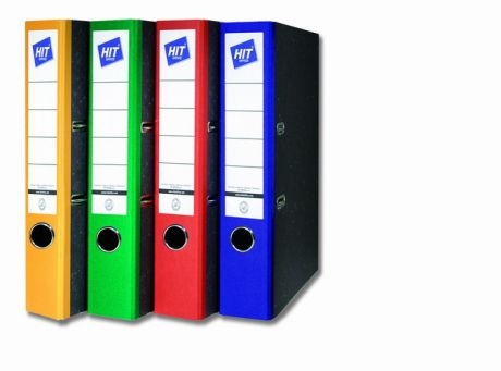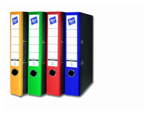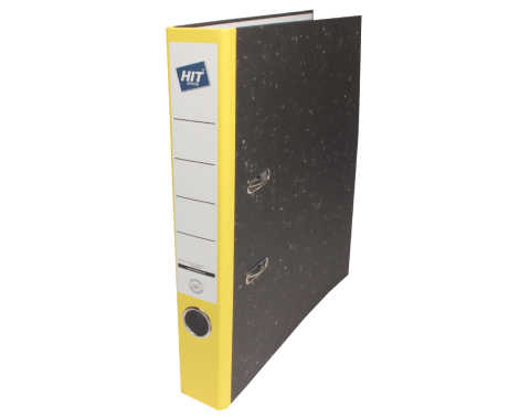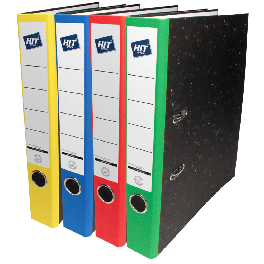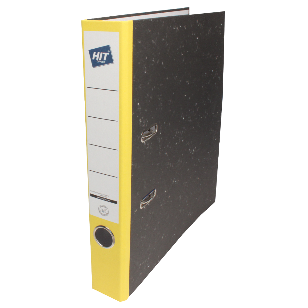 Ordner mit 5cm Rückenbreite, Hebelmechanik, Schlitzen,Griffloch, ohne metal Kantenschutz, Aussenbezug schwarzes Mramor mit farbigem Rücken, aufgeklebtes Rückenschild.