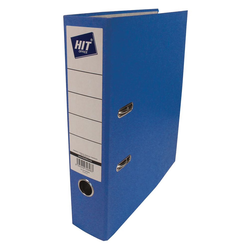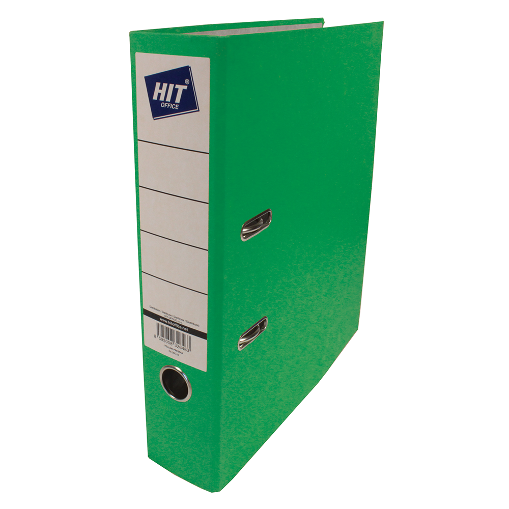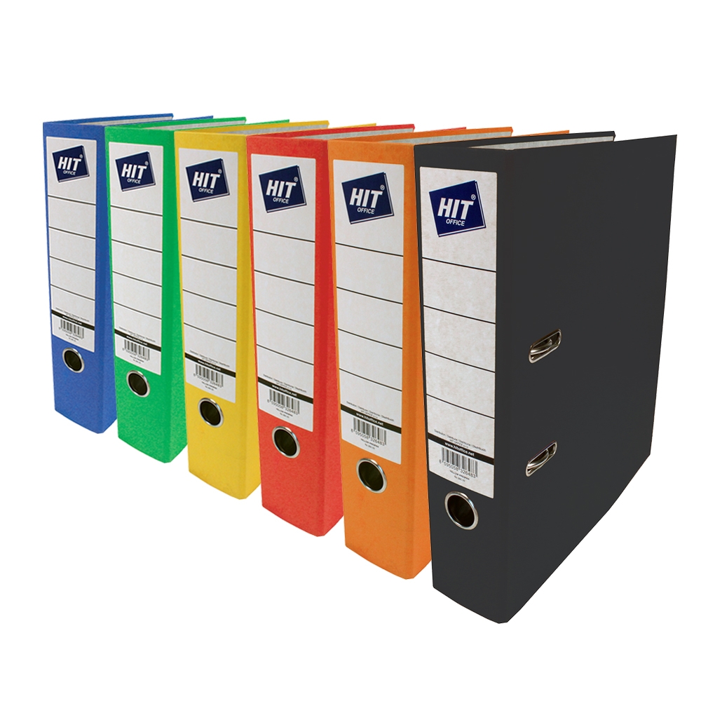 Ordner mit 7,5cm Rückenbreite, Hebelmechanik, Schlitzen, Griffloch, metal Kantenschutz, Aussenbezug farbiges Press-Span, aufgeklebtes Rückenschild.